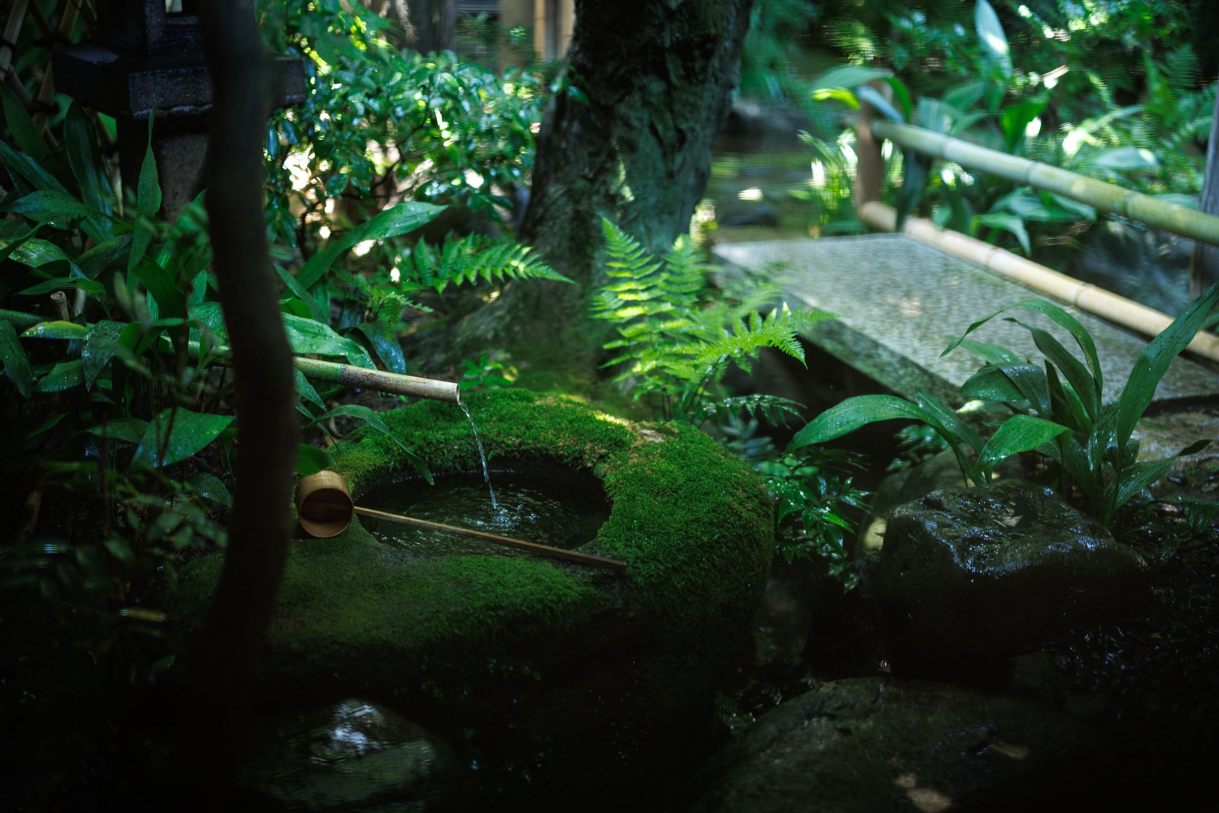 数々の茶室は、中央に据えられた露地を中心に、四方を囲むように方形の構えを取っています。巧みに設えられたこの構成は、内に広がる静寂の領域と、外界に満ちる喧騒とを明確に隔て、都会のただ中にあっても、茶の湯の本懐のひとつである、思索と洗練のための聖なる空間を創り出すという精神を、見事に具現化したものといえるでしょう。